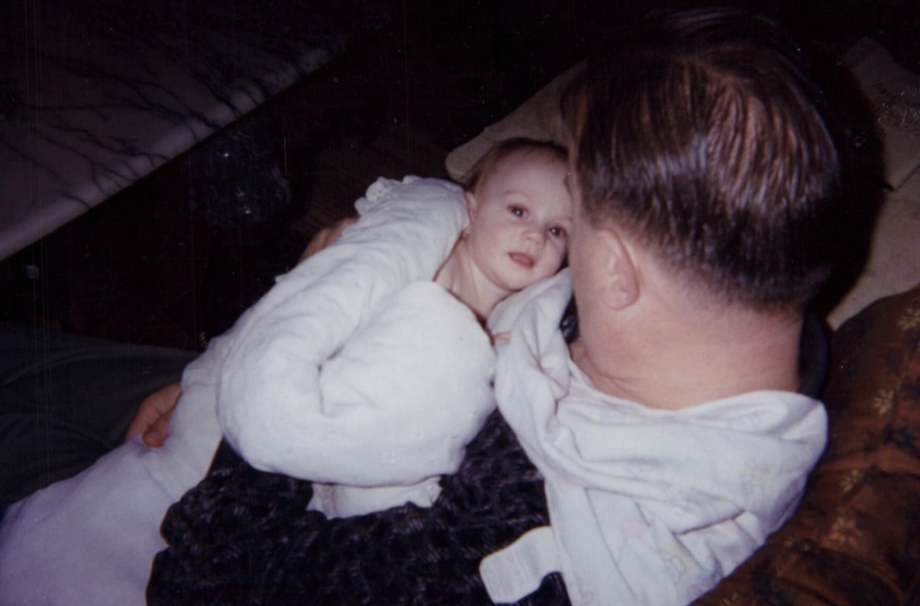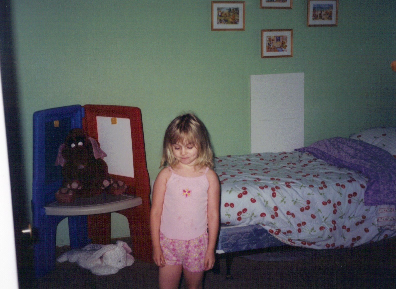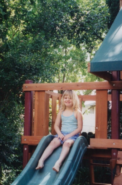 Me in my childhood bedroom (left) and me on the play set in the backyard (right).